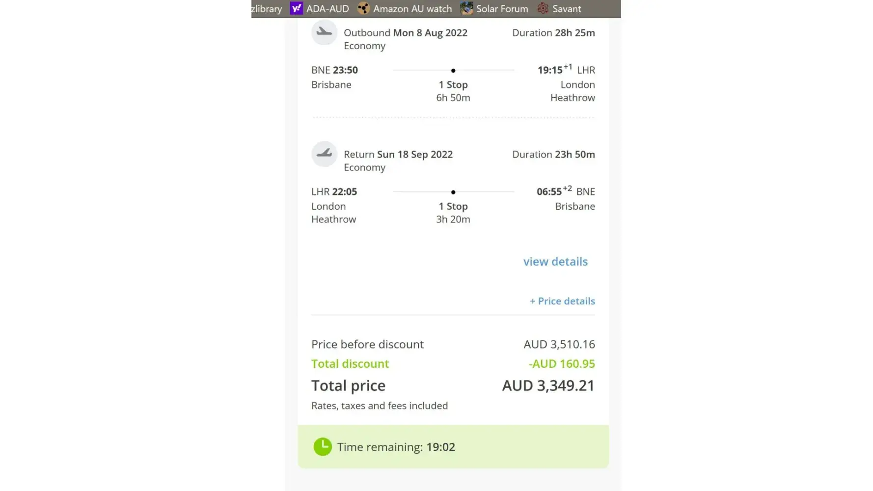 Booked two return flights from Brisbane, Australia to London, UK. Selected "Classic" (apex) option and said "No" to all the added extras, total cost was AU$3349.21