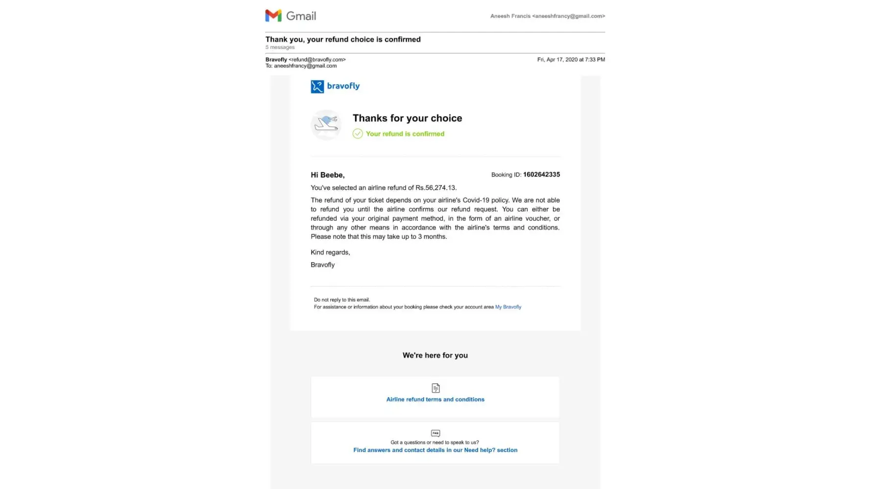 I am Aneesh Francis. I booked 5 tickets for my family from Riyadh to cochin through bravofly on air India flight on 31 march 2020. (Booking ID: [protected]) Due to covid issue that flight was canceled then I request for refund since that 2 years. Now I receive a mail from bravo fly to submit account details. I am trying to enter the details, Its not accepting. ( Its Coming on Red color and not Confirm) there is no contact details for communication