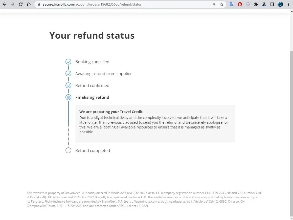 Flight was cancelled by the airline due to the Omicron Variant. I have an email confirming that a redund is due. I have called Bravofly a number of times and they just tell me that they are wiating for a refund from Virgin Atlantic and cannot refund me until they have a refund from Virgin