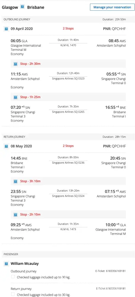 Original flight booked Nov 2019 for travel April 2020. Cost $1610.29 AUD. I paid for a flight for my friend to fly from Glasgow to Brisbane. Flight cancelled on 18 Feb 2019.
