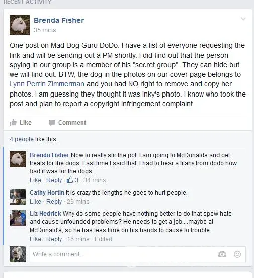 Sherron Boudreau also created a Facebook group and helped support a couple of Pomeranian groups where others in the Pomeranian community was bashed like the secret group created by Brenda Fisher called Little Man Do Do if a person did not fit Sherron Boudreau liking she attacked them, keep in mind viewers, Sherron Boudreau Charles Manson Loving friend Brenda Fisher was Sherron Boudreau best friend, this scam artist Sherron paid for the maddoggurudodo.weebly that bashed the Dodd family and their fur babies. Sherron Boudreau is nothing but a bully, fraud, animal abuser. Master Manipulator and very close to being a extreme narcissistic sociopath, The face book group Sherron Boudreau created was called Pomeranian Witch Hunt with Cathy Diehl Conway as her co partner, later the group was called Pomeranian pumpkins which had plaster on the banner Bullying stops here Love our Pom's & Mom's, The real fact is Sherron Boudreau is the real bully and her involvement in the maddoggurudodo.weebly page and treatment of poor Cubbie and Liz Blu proves the type person she really is . And why would anyone create a flipagram on another persons dog you already sold them, than attacked them wrongfully for not having the dog fixed upon a Veterinarians decision not to, due to his bad heart from neglect and abuse, Cubbie was treated like a piece of meat, when used up sold off like a piece of meat, For Sherron Boudreau lies she was being bullied this was only fabricated in her behave to gain popularity and cover up the real person she is, We also provided screen shots where Brenda Fisher plays favoritism only allowing Sherron Boudreau to ask for funding money in a group Brenda Fisher once ran and now is banned from that group, which we found this a bit odd and suspicious, Sherron also create the face book group POMERANIAN LOVERS AND FRIENDS