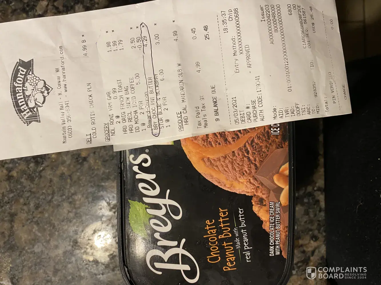 I purchase this product, Breyers Chocolate Peanut butter cup a few times and while sometimes I've noticed that they skimp on the peanut butter and it's not nearly as good as Turkey Hill brand (this store doesn't carry it), I've had no major complaints until tonight. I purchased a half gallon at Hannaford supermarket and I got home to dig into it I found that there was not a single drop of peanut butter sauce in the entire carton. It was plain chocolate, I even dumped out the entire carton into a large bowl and stirred every inch of just to make sure. Nope. Plain Chocolate. i've noticed on this board that Breyers has had many, many complaints about your ice cream not having any of the items as described. I have never in my life (I'm 51 years old) opened a manufactured product and gotten a completely different product than what was on the box. I don't know how Breyers could consistently screw things up like this and their ice cream isn't cheap! I grew up on Breyers ice cream but I'm saying goodbye now. It has changed for the worst. I want my money back so I can go buy a carton of Turkey Hill or Friendly's. I have attached a picture of the box and receipt as proof of purchase.