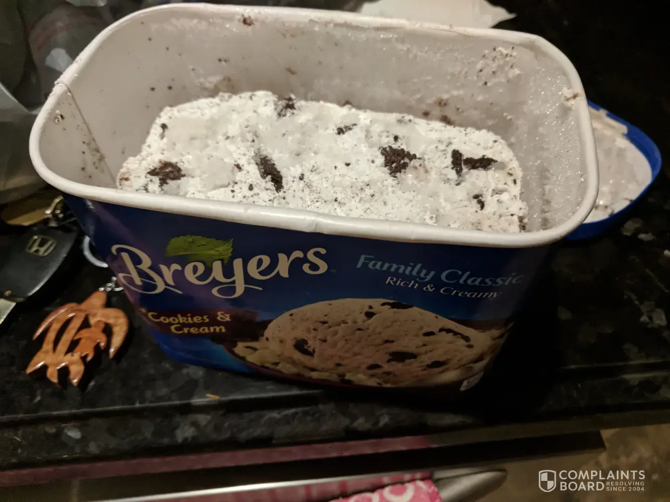 The ice cream tub was about half gone when I purchased it. There where large amounts of ice cream missing from the edges, and the top of the container. To top off my purchase the tub was also complete freezer burnt as soon as I brought it home, as I opened it right away. I normally purchase Breyers ice cream as it is a family favourite around my house, however, I have not bought Breyers ice cream since my experience. I do not know what happened to your quality control.
