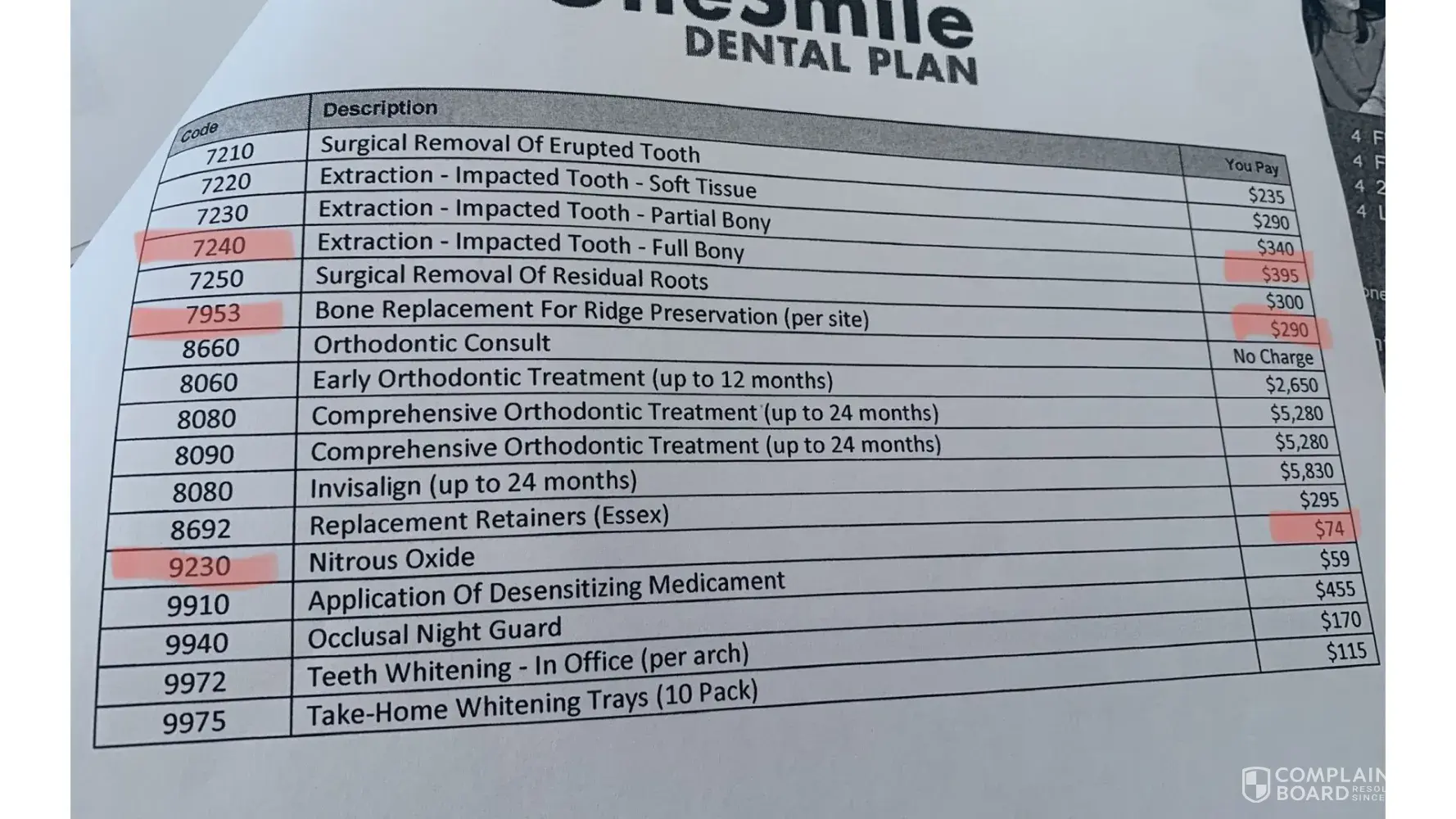 Better pics of the overpriced charged service highlighted are the code number we received are not matching the prices on the dental plan paper. Full bony extrac we got charged $420 on the plan its $395. Bone ridge was charged $600 on the plan its $290. Nitrous we were charged $112 on the plan its for $74.