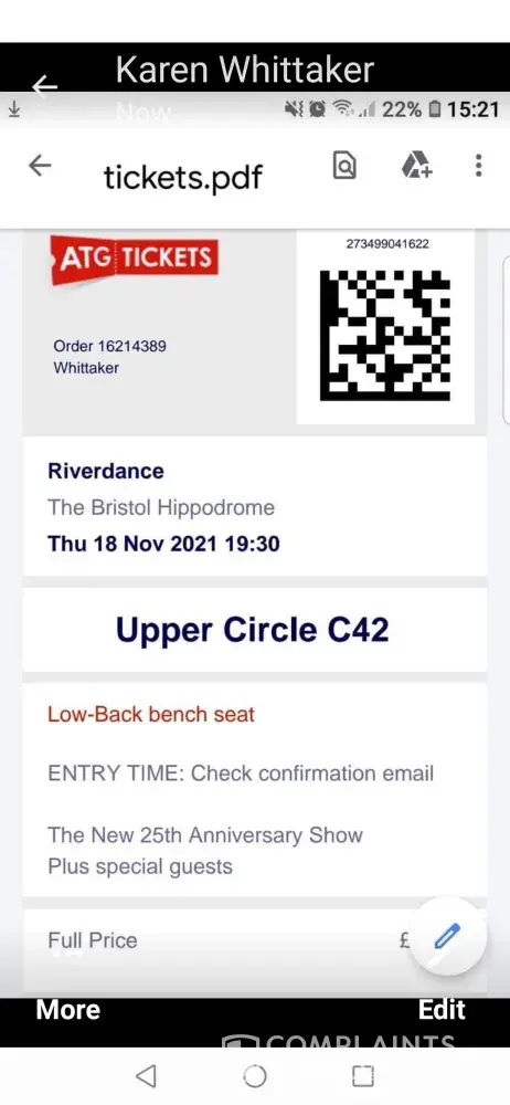 I had 2 tickets for the River dance performance at the hippodrome Bristol. I scanned my bar code for my seats C42 and C43 the circle. When we got to our seats they were already taken. The seats had been sold to 2 other people as well. This is disgusting. While the staff were trying to sort this out we were still standing off to one side and the show had already started. They wanted us to go out of the show and sort it. I refused. We were found seats after a while. The seats were not together and this is also disgusting. The whole show was ruined and this is the fault of the Hippodrome. We should be compensated for the way we were treated. Mrs Whittaker The 2 tickets are attached
