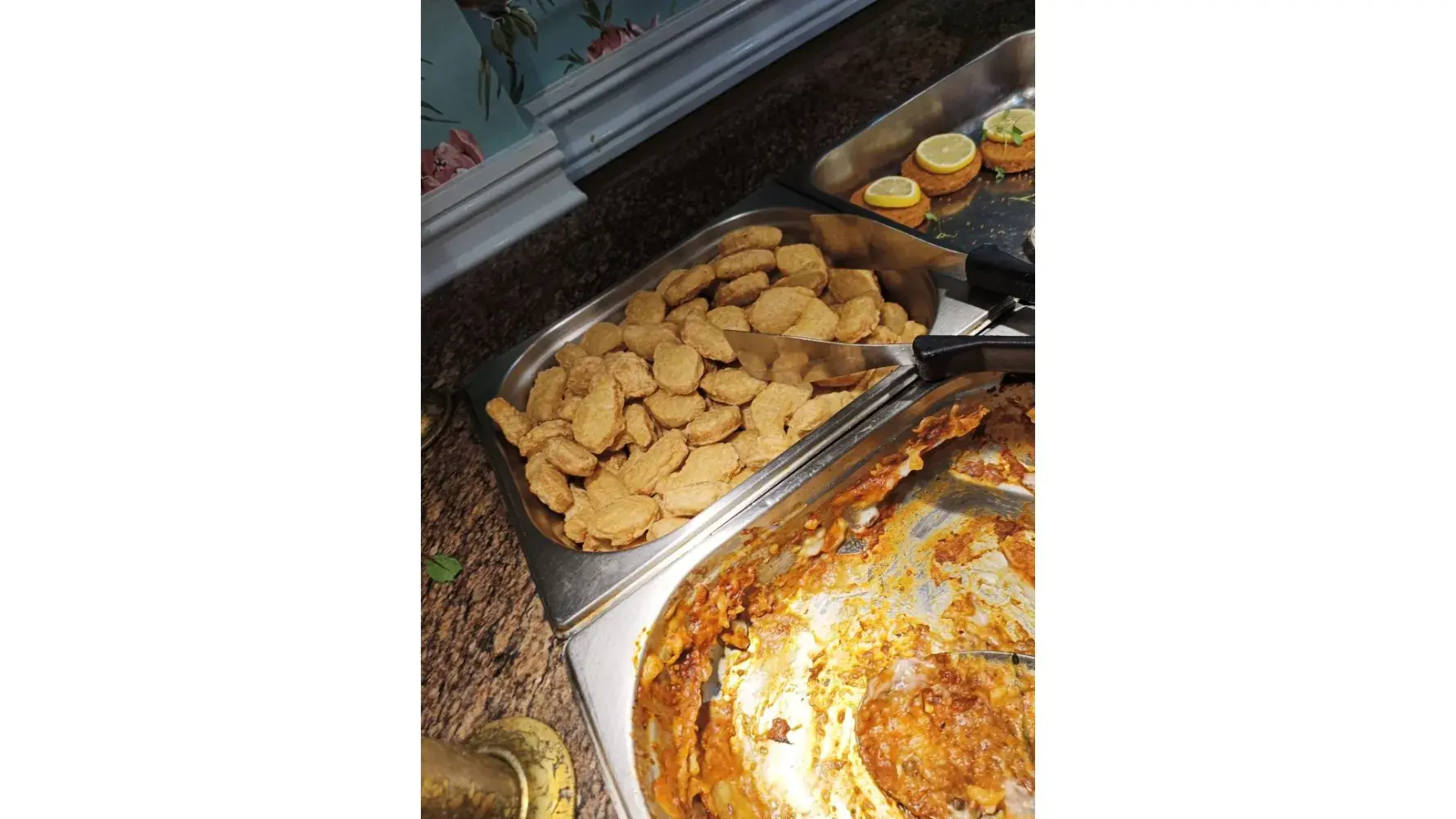 as photos show bought in frozen fishcakes, chicken nuggets, frittata that had been overcooked and grey and lasagne not replaced all served with roast potatoes