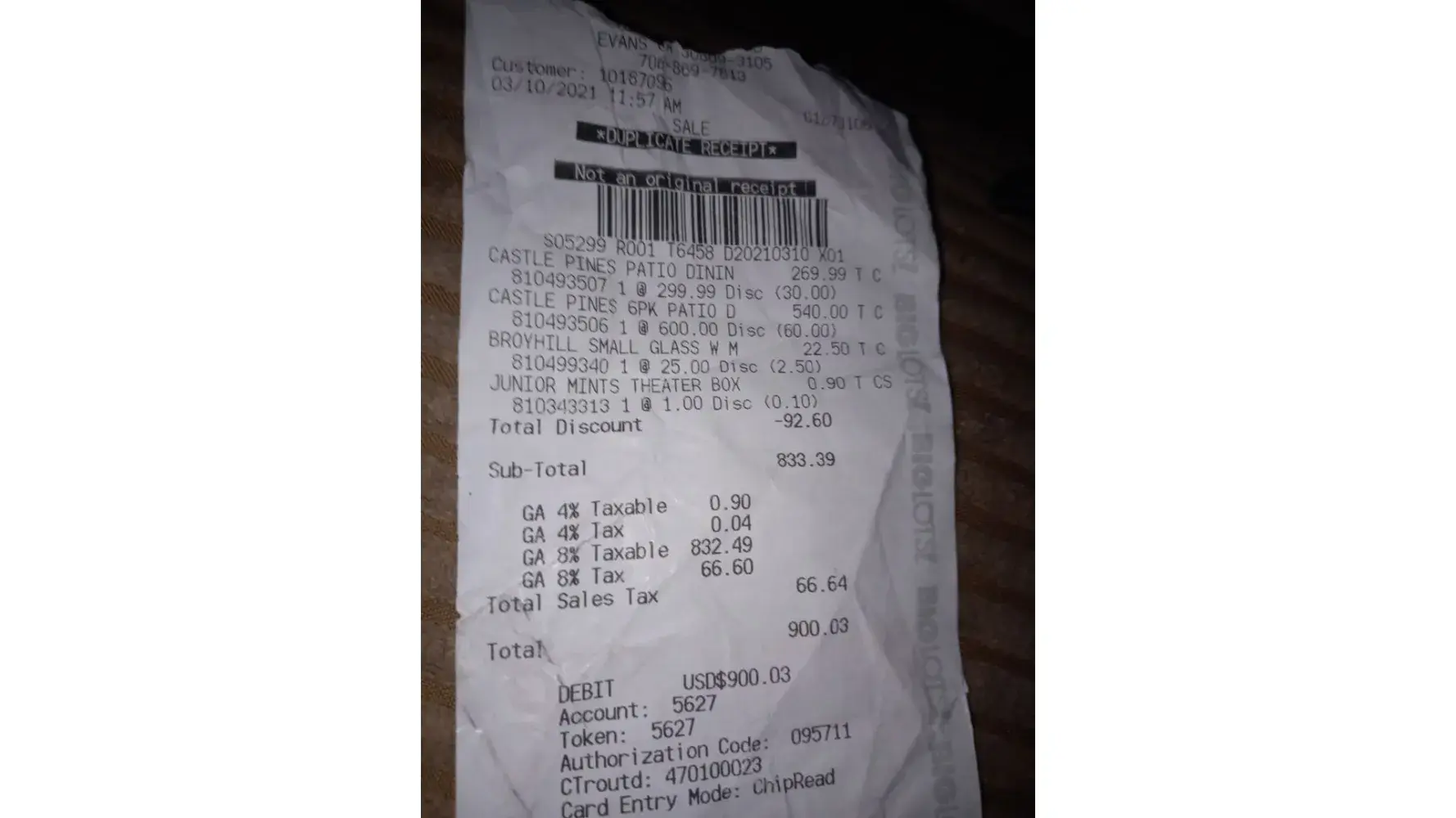 2. We bought the castle pines patio dining chairs, table &loveseat on March10, 2021 at a BIG LOT store located in Evans, GA.
