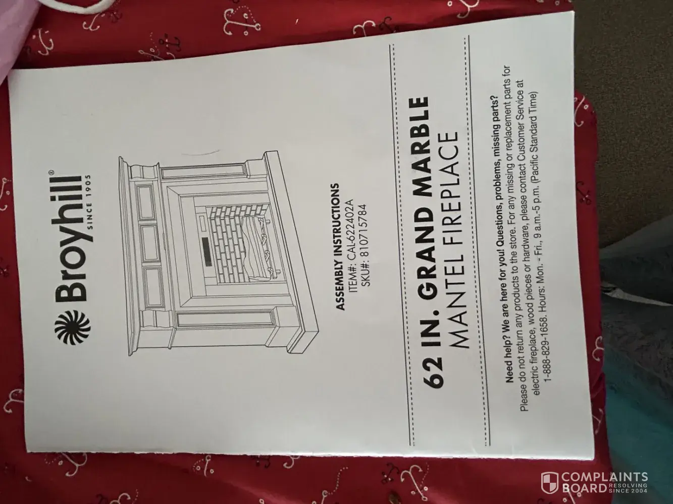 Broyhill 62†Grand Marble Mantel Fireplace. Item #: CAL-622492A. This electric fireplace has a manufacturing defect in one of the slide in connectors. I need replacement panels. I have tried two service numbers. Neither is in service. There is a recording that tells you to contact the retailer. I did. They had no suggestions to try. I purchased this at BigLots where I live just before Christmas. They are now out of business.