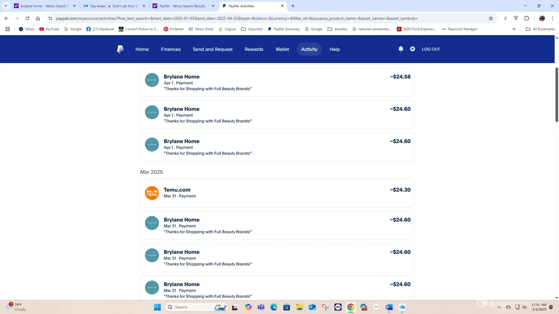 dates charged March 31, 2025 and April 1, 2025