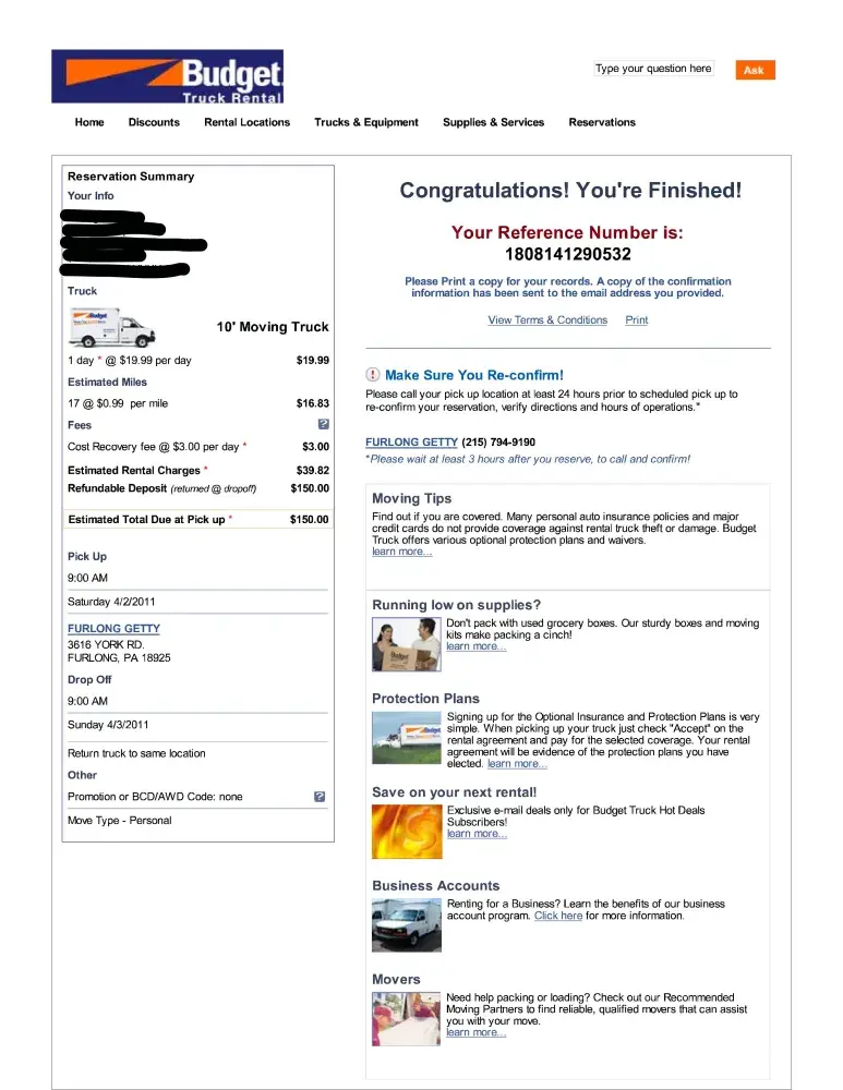 My wife and I were moving in the end of March 2011, I've reserved a truck with Budget two weeks in advanced to make sure we have something to move us. A week goes by and I get a confirmation from Buget "You're Truck is Available!" Great, right. Wrong, the day before the move the rental facility calls me to tell me that there's no truck available for the me! WTF! I call up Budget and inquire as to how a truck that is said to be available for me a week before the move is now not available on the evening of. The rep told me that I cancel it myself and that they were going to charge me an extra $50 for cancellation, what kind of a company tells your one thing and turns around and said something completely different. Budget, if any of your marketing department is reading this, GET YOUR HEAD OUT OF YOUR ### AND JUST SHUT DOWN! If you are moving stick with Uhaul, reliable, dependable and fair priced.