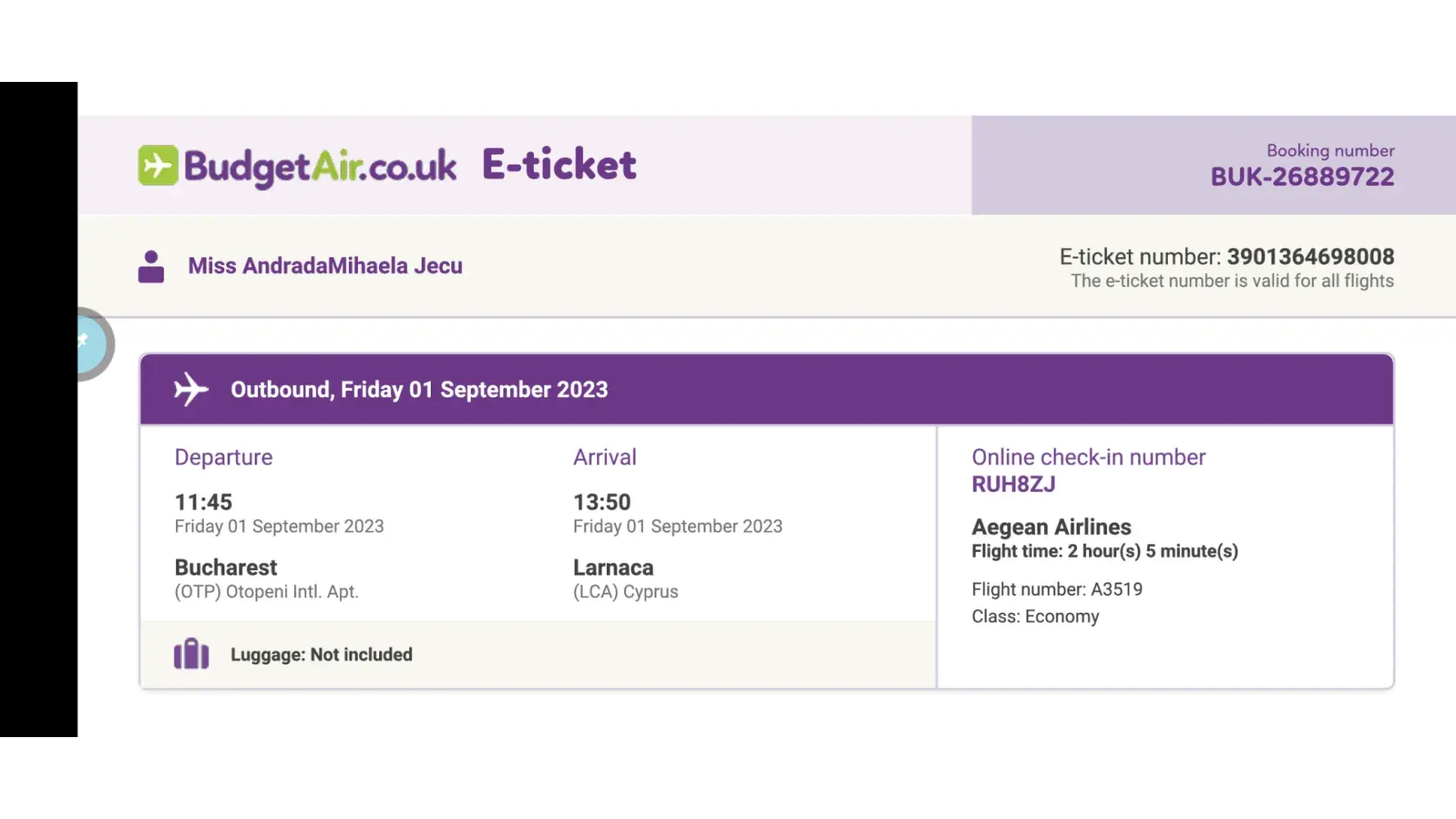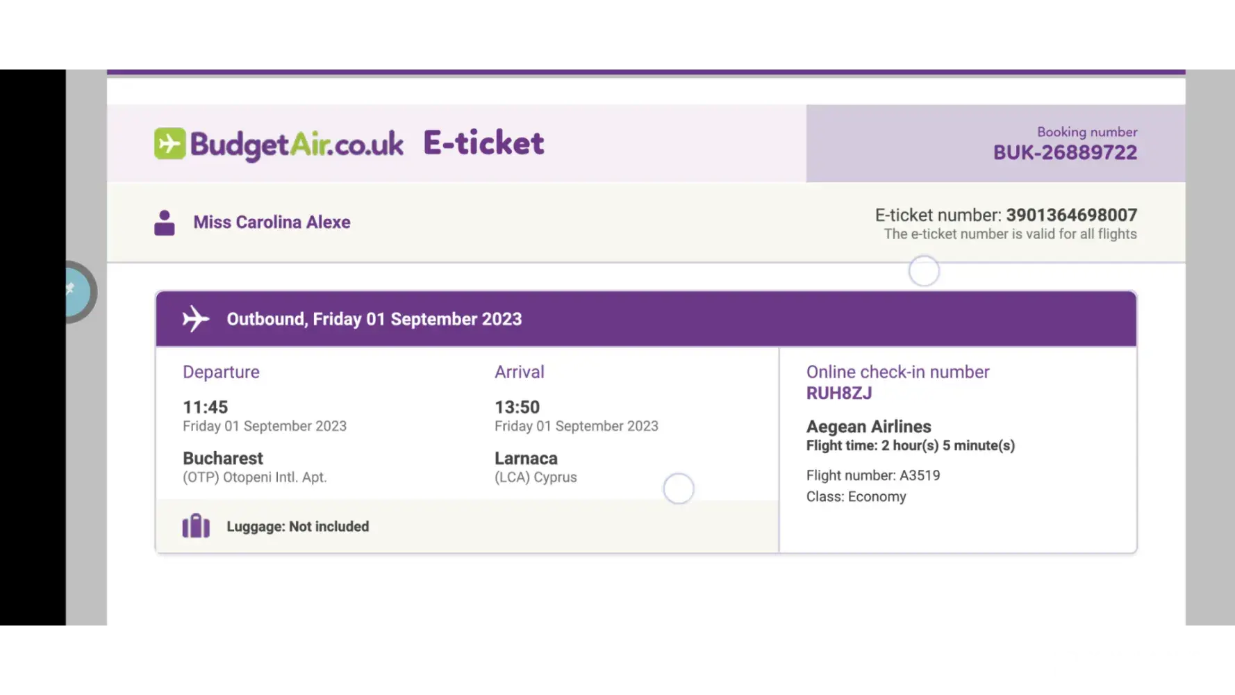 Skyscanner redirected us to BudgetAir.co.uk to complete tickets purchase for 01 Sep OTP-LCA flight - A3519 (Aegean). Bought 3 tickets on 27 Feb.