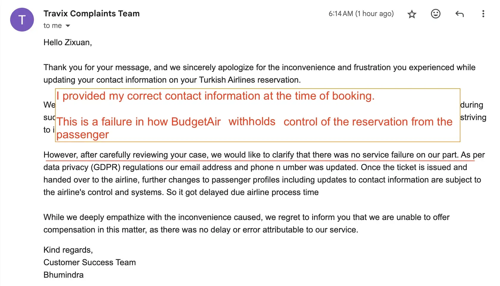 After two weeks, BudgetAir finally corrected the incorrect contact information in my Turkish Airlines booking — but only after I filed complaints with regulatory bodies and repeatedly followed up.