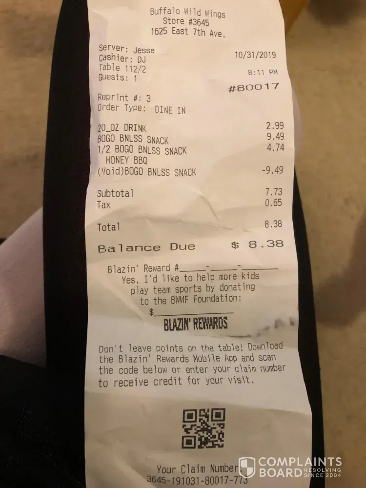 Hi my name is Elena today November 6th at 11 pm I went to eat dinner at buffalo wings with my boyfriend my daughter, my friend and her baby. We got there and sat down. We waited 10 min to get our drinks when we got out drinks we placed our order. I got a small traditional honey bbq and for the free one I got a medium sauce. My boyfriend got the wing and...