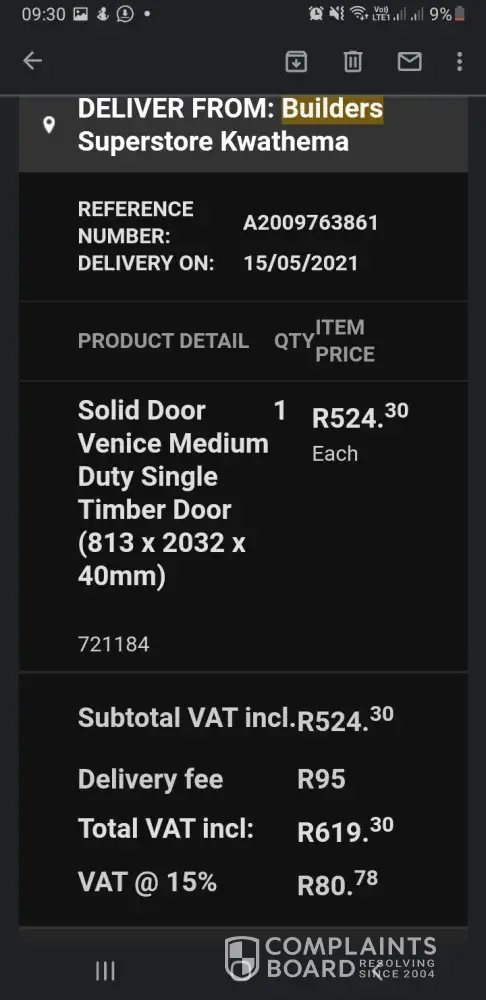 Please see mail send to [protected]@builders.co.za complaint ref no: [protected]