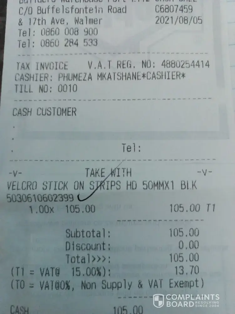 As can be seen from the attachments the Heavy Duty Velcro is advertised for R66.00 each and when I went to purchase the item on the 05/08/2021 I was charged R105.00.