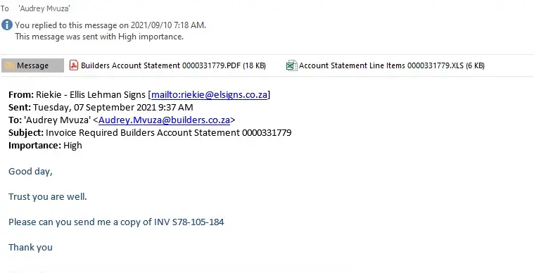 I sent an emails everyday from Friday 02 September up until today 10 September 2021 requesting a copy of an invoice for the debtors department with no response.