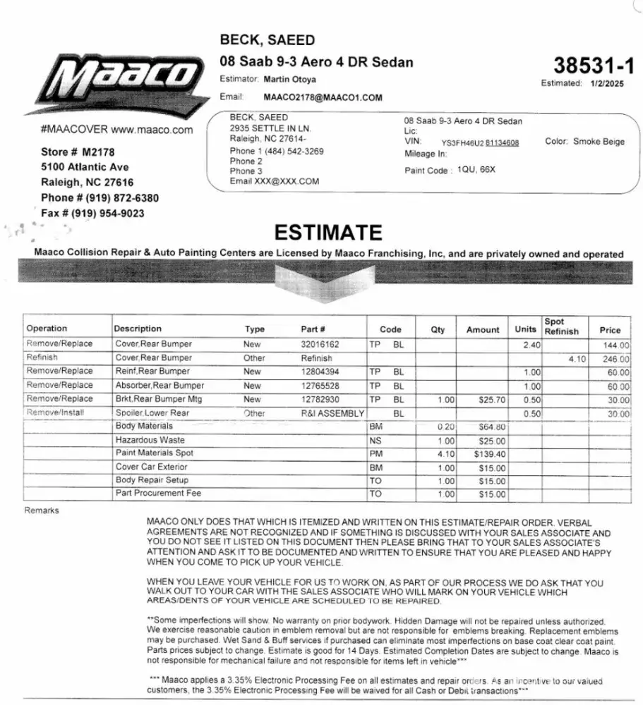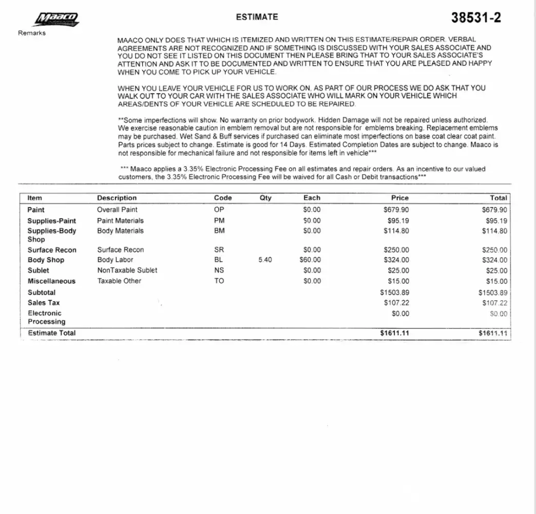 Claimed loss: $524.17 for the bumper.$887.50 for Maaco who removed my old bumper, painted and prepped the wrong bumper, and then reinstalled my old bumper.