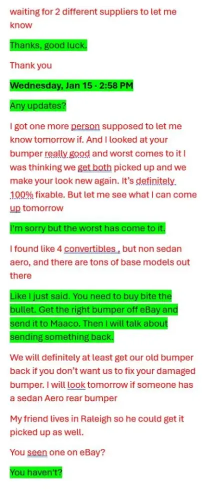 The bumper was for a convertible and not my car. Maaco alerted me of the mixup and I alerted Marian who could not do anything but take the wrong bumper back. So, Maaco had no bumper except my old one so they put back on. Marian said sorry for the mixup and thats the last I heard from him.