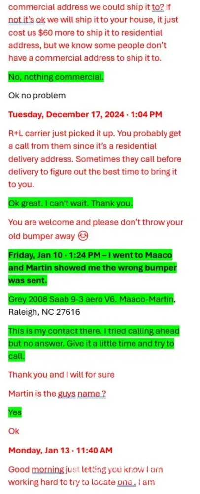 I received texts from Marian Jitney about the bumper. I only have one email from him and that is because it's an invoice separate from ebay. Ebay resolution office has no record of the sale because he uses paypal through email.