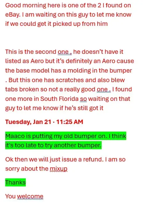 Desired outcome: FULL REFUND for the wrong bumper and all the charges incurred as a result of the "mixup".