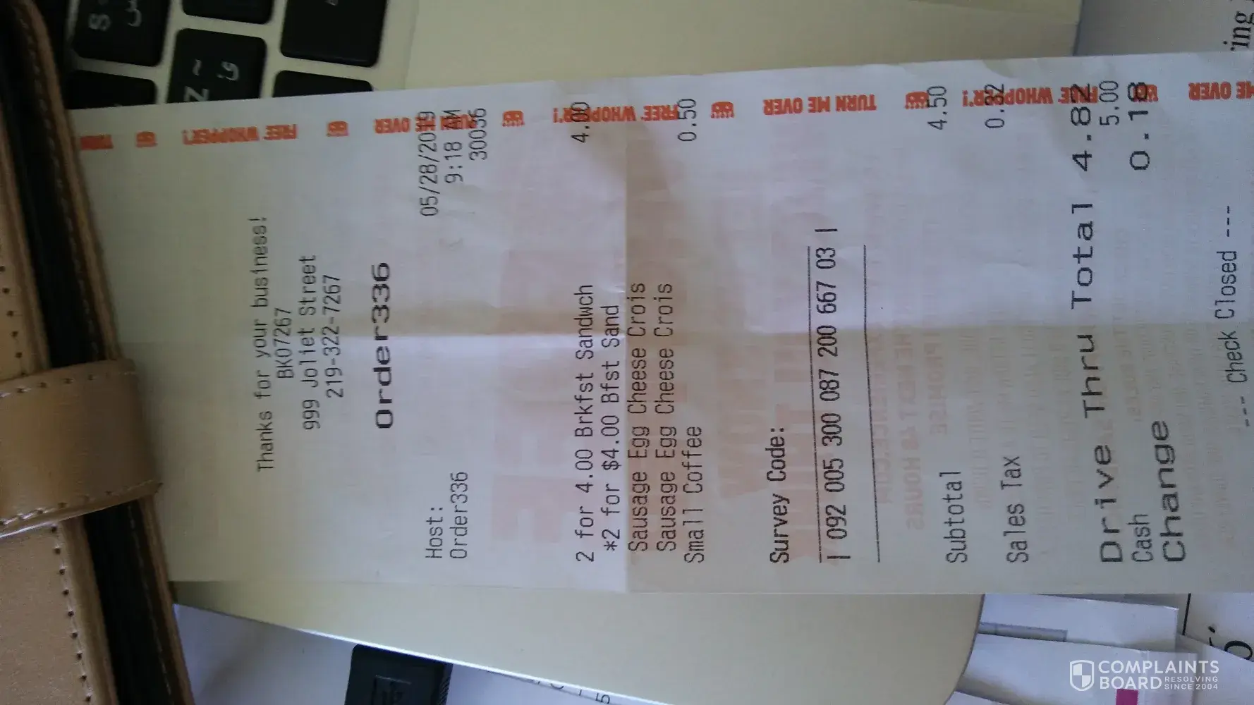 I ordered Breakfast at your Dyer Indiana Location BK07267 Host #336 order # 336 at 9:18 AM Central Time on May 28 2019 at 999 Joliet Street Dyer IN 46311