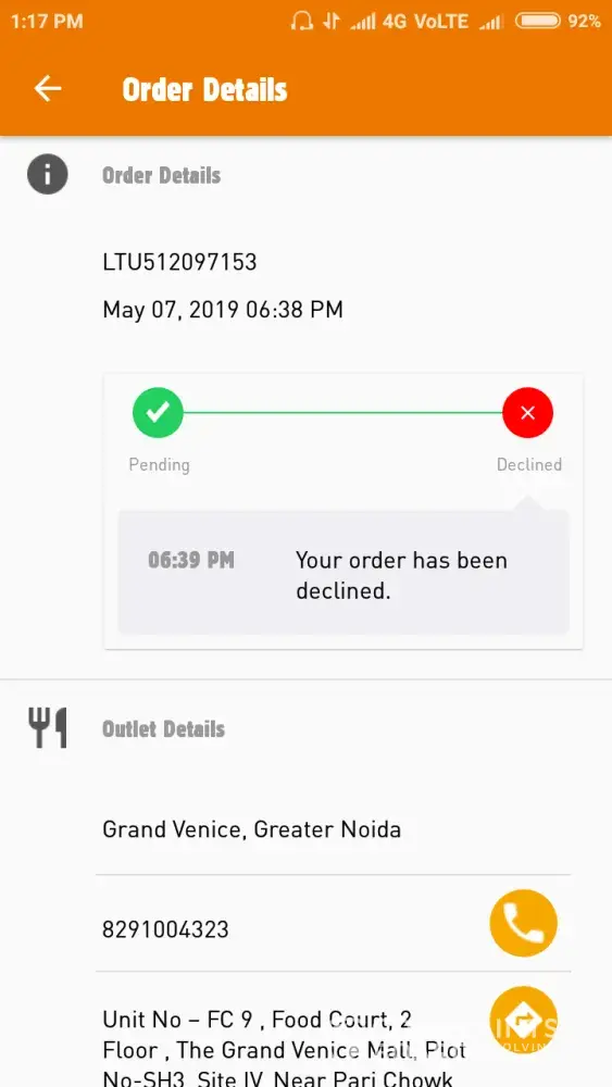 I have ordered burger from burger King aap.. And payment was also done of ₹117 on 6 may 2019.. After sometime I received a message that my order has been canceled.. And then outlet manager called me and told that my money will be refunded.. But till now I have not received my money... Please refund it as soon as possible. I have attached photos of bill detail and order detail.. Please see to it.