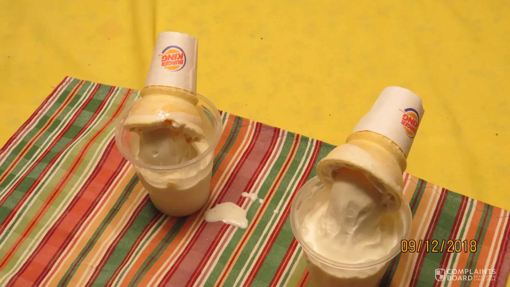 This happened wednesday sept 12, 2018 at approximately 7:30pm. Receipt survey code [protected]-080009. I went into the janesville wi burger king located on center ave to order an ice cream cone. A young male came to the cash register and took my order. He then went off to my left and rummaged around. Suddenly, he hollered "pat! Where are the ice cream cones?" a female voice hollered back "right where you are standing!" he hollered back "can't find them!" a female appeared and handed him some ice cream cones. He filled them and handed them to her. She then brought the cones to me. I asked if she would put them in a container... Meaning one of those cardboard trays that you can get at most anyplace that serves ice cream cones... You can put 4, sometimes 5, cones in them and they stand straight up. She went back to the cone dispensing area, looked around, then pulled out 2 plastic drink cups, jammed the cones upside down into them and handed them to me. At this point, I was so disgusted I walked out. My wife, out in the car, looked at the ice cream cones upside down in the plastic cups and said "what is this?" I replied this is what we get for coming here for an ice cream cone." picture attached. Unbelievable!