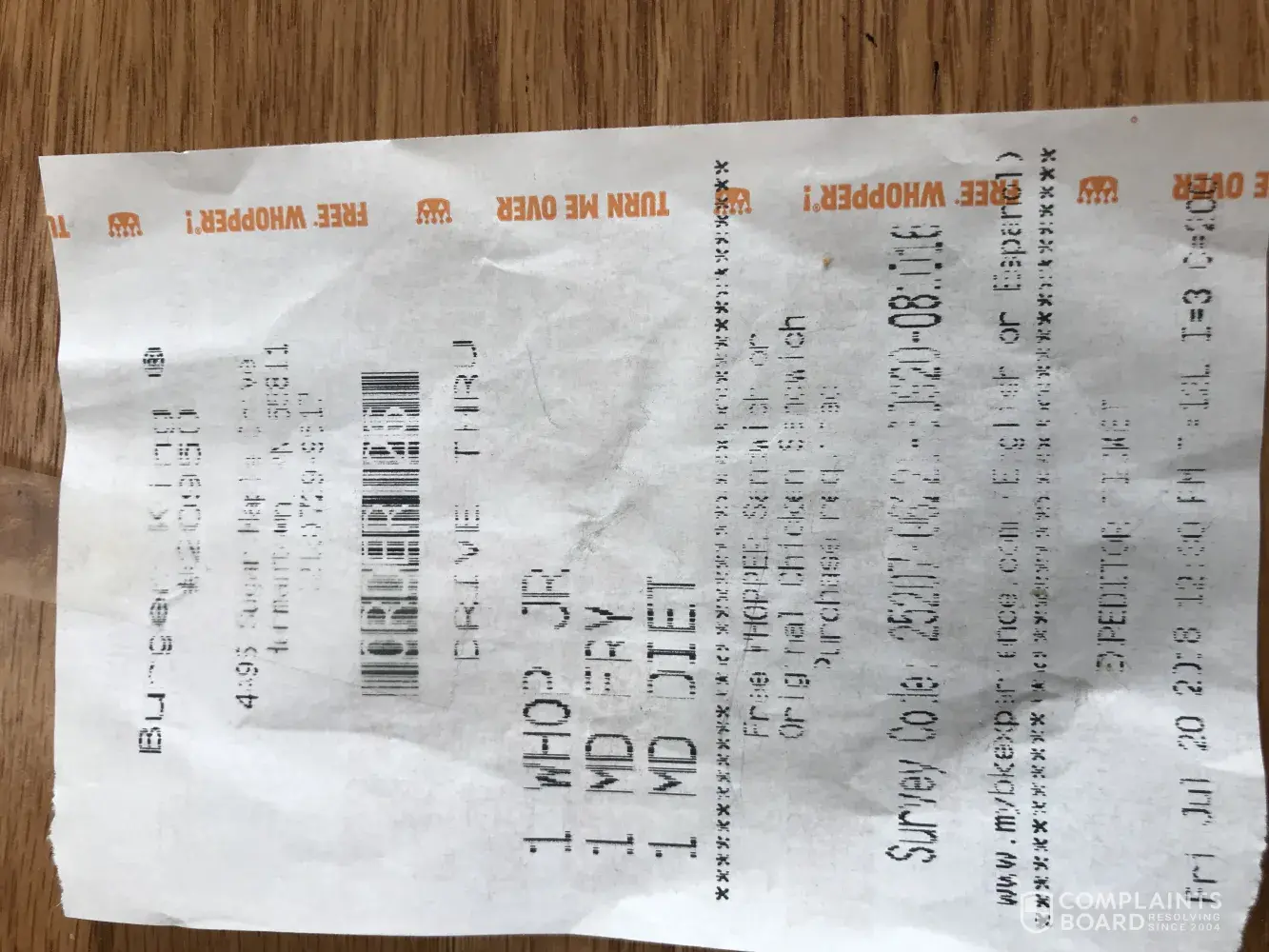 I went to order a two 4 $6 whopper and chicken sandwich. I got my chicken sandwich and was fried so hard and shrink so bad it wasn't even ediblealso the onion rings I ordered was not fresh u can tell they been sitting. I called Burger King customer service and made a complaint was promised a coupon for another meal never received it. This isn't my first time having issues with this location about food not being fresh. All I want is for them to keep their word.