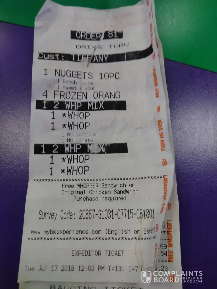 Ordered to go, two whooper with just onions & lettuce got home & guess what, it had everything but the kitchen sink on it. I thru it in the garbage because I am allergic to mayo & don't eat tomatoes or pickles. Thanks a lot Berger king. I did not go back because I had to unpack groceries & I live two far. and it was raining cats & dogs, also the entrance door was jammed for 2 years I even hurt my back when tried to open it. I told the manager finally after two years it was fixed. I always preferred You over McDonald But I think this branch is going down hill. They are also not very friendly. They do not greet you with a smile or an hello. I remember when I used to go there I always was greeted with a smile & a real how are you. Now it's, can I help you, with a look like Y are you here. This branch needs a shake up from the Corp. office. You need to screen your hiring practice better. They want $15.00 an hr. please they are lucky they have a job at all. Can't get a simple order right. Sorry to be so negative but it's the truth. John D.