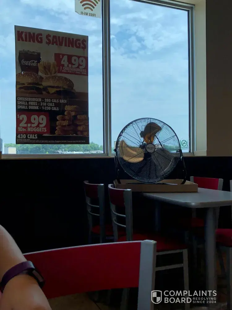 I went there today (July 2nd 2018) with my family. We ordered and sat at a table. They had one fan on a table pointed toward the other tables to try to keep guests cool, though with the humidity the fan did not help. Other guests refused to stay, and were complaining about the lack of cool air too. I was surprised because i had not ever visited a Burger King with such an uncomfortable environment to sit and eat. I was sweating while eating. In fact, I'd say it was cooler outside than in that restaurant.