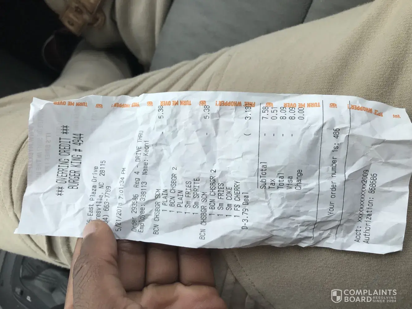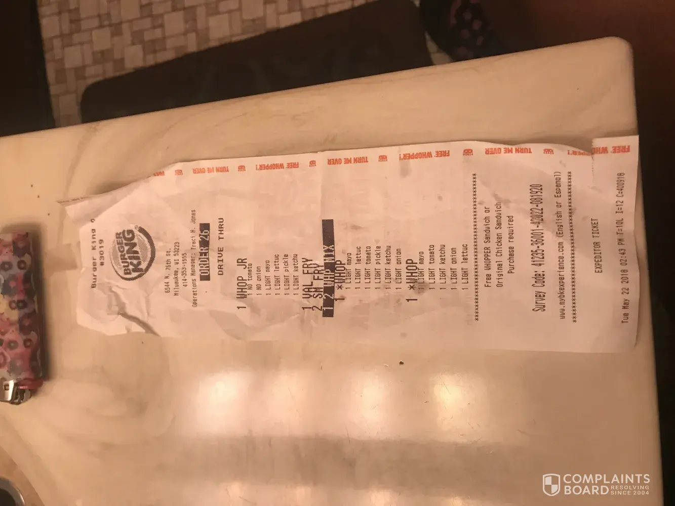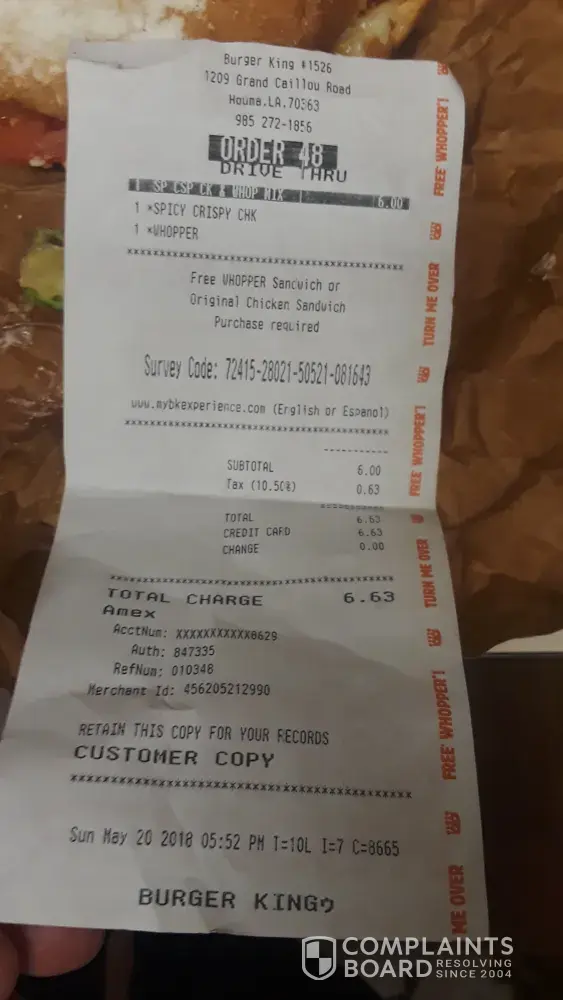 Hello, just did a drive thru order at store #3019, upon Receiving order daughter look into bad and thought all four sandwiches was in there because of the size of the whopper so she thought it was the 4th sandwich, missing 1 whopper jr and been over charge. Got all the way home to discovered it and I ask for receipt they said the receipt machine is broken and I also call 10 times no one is answering the food, never again in life will I go to this ghetto location of a Burger King. I knew my total was incorrect because of the change I received back. However I had a coupon and gave them the code for 2 whopper jr and 2 fries, instead this is what the receipt show, but I thought they receipt machine was broken they did not give me the receipt to see my total, I am beyond pissed
