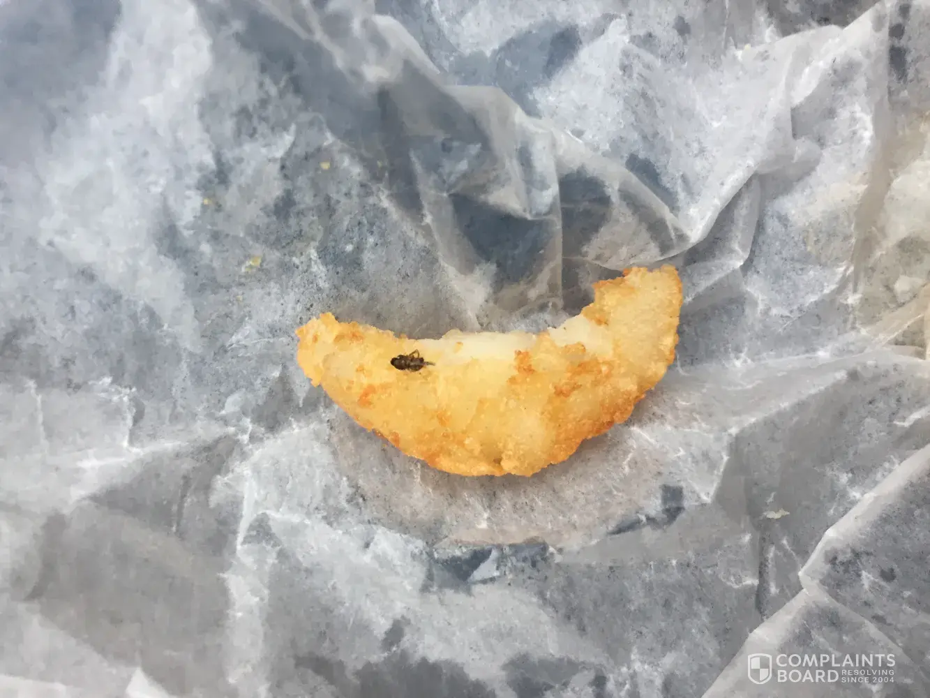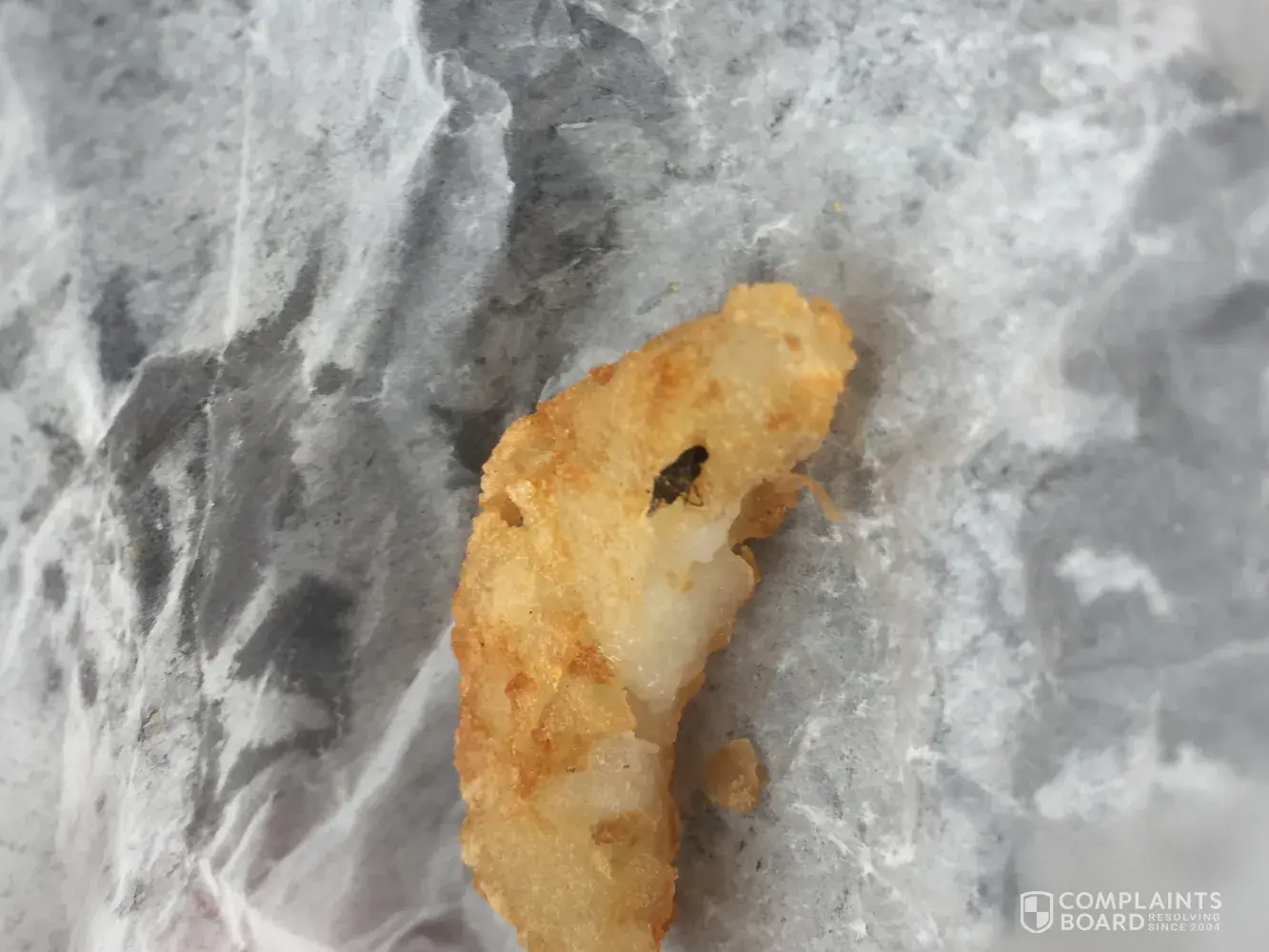 I ordered breakfast from the drive thru this morning and while driving to work my wife took a bite of one of the tater tots/hash brown pieces and she saw a small bug on it. Luckily she did not bite into it. She almost vomited and we both immediately stopped eating. We both felt nauseous. This was such a horrible experience that I will never give my business to Burger King again!