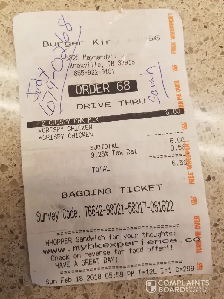 The Burger King in Halls Crossroads phone number [protected] address 6825 Maynardville Pike Knoxville Tennessee 37918. Got two chicken sandwiches for the $6. Got home they were so dried out tough and very dark. Probably been laying under a lot for a very long time. Went to the Burger King's to get my order replaced or money back. The manager on duty refused to replace my order or to give me my money back. Was very disrespectful argued with me they were not bad it was just the breading on them. Have pictures. She kept my receipt said she would show it to her general manager to see what she says about it. I have never been treated so bad in my entire life over to chicken sandwiches. Or any food for that matter. This lady needs to be fired big time in my opinion. I'm a Christian person and don't believe in treating anybody that way over to sandwiches or for any reason. My name is Judy over hope my address is 310 Butler Lane Maynardville Tennessee 37807 my phone number is [protected]. I called the main corporate office that was in Florida phone number [protected]. They gave me an address to send pictures to that will not come up. I filed a complaint.