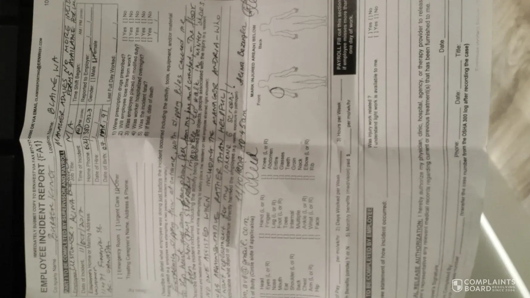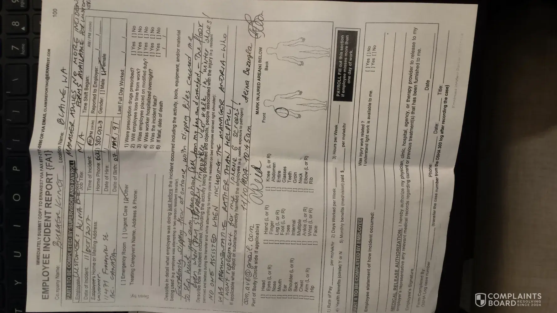 I had mailed a copy of the complaint to Burger King but have not heard back. I am resubmitting my complaint electronically. The Burger King Manager Ms. Andria did not even have the proper paper work. I had slipped as soon as I entered burger king in Blaine, WA on 11 October 2017, at approximately 10.30am. The floor was extremely wet and slippery and the yellow sign was placed in a position where someone entering could not see it clearly as it was placed in a position far in front. As a result, as soon as I entered I slipped and hurt my hand, my iphone went flying on the floor cracking the glass cover. At this point, the manager say this as did the other staff but NO ONE came to even help me. When I went to tell the manager what happened, she started arguing with me and blaming me! It was totally disgusting and unbelievable! I went to the car and called my boyfriend in. He was appalled at what happened. At this point, Ms. Andria the manager, started arguing with us, telling us it was my fault for not seeing the yellow sign. This is a clear health and safety violation that requires further action. The staff were not only negligent in their safety duties towards customers, but also were arguing about it. Furthermore, she did not have a Client/Customer Incident Report. Instead, she gave us the wrong form "Employee Incident Report FA1" - which is atttached to this message. Ms. Andria has signed the document at the bottom. Burger King management staff has clearly been negligent in Health and Safety, and also poor attitude toward a customer. You may request and view the video camera footage. I am demanding compensation for the injury, and damage to my iphone glass cover. Thank you. My email is: com.[protected]@gmail.com or [protected]@gmail.com