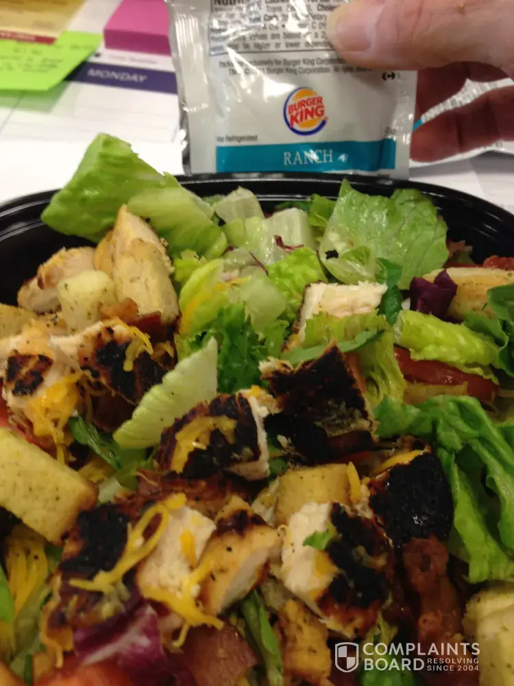 I purchased 1 Salad with Grilled Chicken today for my lunch which I took back to work with me. When I opened up to eat it, the grilled chicken was burnt...I called the Burger King, State St, Watertown, NY & the lady who answered apologized & said she wud replace it with the crispy chicken which I did not want & I was back at work so I cud not go back with what I had to replace it. Yes I ate the salad but I threw out the burnt chicken as I needed something for lunch & was ok but not what I paid for. The girl also said she has no control when the chicken goes thru the grill...seems to me when they put the chicken on my salad they wud have noticed it was burnt & either said something to me or replaced it? I was not happy & maybe shud have gone to McDonalds...altho I usually prefer Burger King. May have to rethink that now...Thank you for your time.