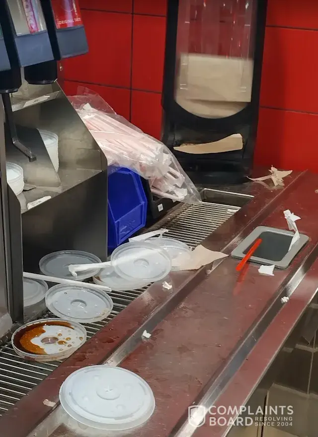12/28/22 9:30pm Dining Room Service I entered this franchise and immediately observed the trash receptacles were full, the dining room tables were cluttered with previous diners' trash and the beverage station was covered by liquid spills, napkins, and cup/lid refuse. The front end staff were milling about and chatting as customers entered and took several minutes to respond to walk-up inquiries. I have pictures.