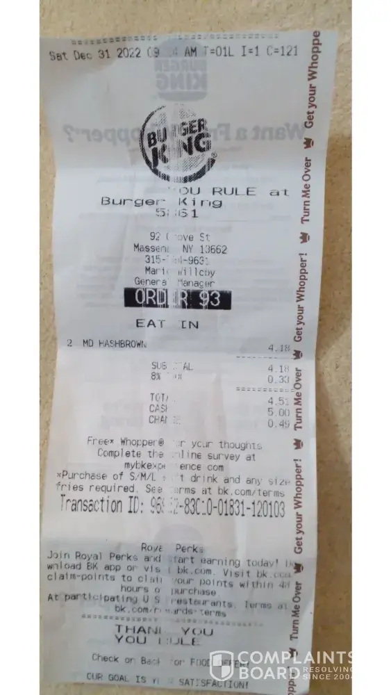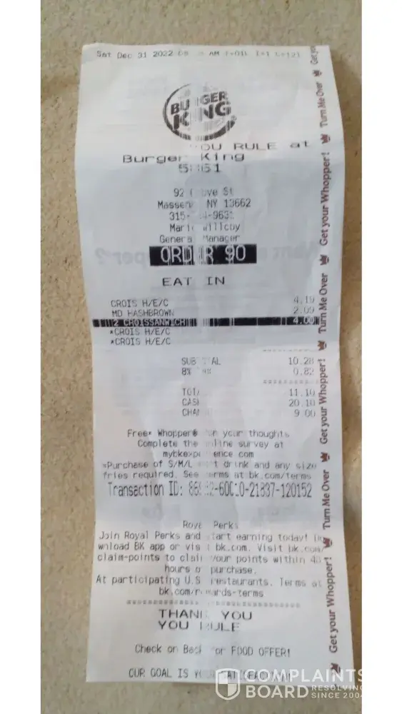 To Whom It May Concern: On Dec -31-2022 I was a customer at your Massena New York facility on Grove Street store # 5861 General Manager Mario Willcby, order # 90 , now the transaction number is hard to read due to the clear smudge mark on the center of the receipt ,but I will try my best to read it to you, ID # 86 blank blank 2-60C:[protected] that's the best I can read because of the blank space. I asked the female I believe was an asst manager if the two for one sandwich are still available? " she said yes" my response was ok I would like three ham, egg, cheese, croissants separate orders so that means two two and two right? " she said yes", just about that time the manager walked up to her and she stated he wants 6 croissants sandwiches he just looked at me I asked was that ok he stated yes if you want, I laughed and said "yes this is Burger King have it your way" then I added three med hash browns to my order, then paid what she rang up which was $11.10 shortly after she gave me my order and I left. When I drove 2.5 miles to home opened the bag to my dismay there was only three croissants and one hash brown. So I drive back to the store walk in and a very stout male employee stated to me " it took you quite awhile to come back" my response was I live 2.5 miles away on Cline Drive" then went to the same asst manager and told her what was in the bag and that she knew what I ordered and you did not put it ll in the bag I should have got 6 croissants and three hash browns, she stated ok I will fix it and give you a twenty percent discount and rang up the three sandwiches and two has browns told me the total, to my surprise I asked why should I pay again for the sandwiches? It was three separate 2 sandwich orders = 6 per order and three hash browns in which I did not receive. Perhaps she could not figure that part out. I stated " I am not going to pay for the sandwiches that I should have been in my order, just give me the two hash browns and I paid for them and I stated to her this will be my last time I come here. She abruptly went over to the manager and was about 12 feet away and told him about what happened in which nothing came from the chat. I then stood there waiting and noticed the stout male employee was standing in front of the serving area for the hash browns leaning on the counter doing nothing, I then stated "can I please have my hash browns" , the asst manager abruptly left the manager and went right up to the male employee and was whispering to him in reference to myself finally prepared the hash browns bagged them and turned and put them on the counter. Long story short, Never to return to Burger King Again...