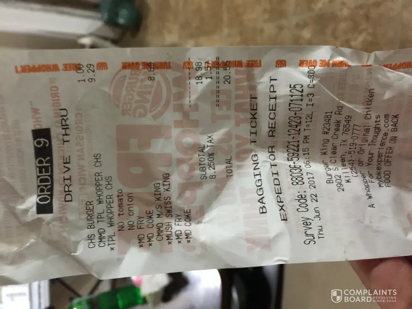Placed my order waited and received order and left. Once I get to my office the two whoppers that were ordered were with cheese and neither on had cheese. I was charged for the cheeses and No Cheese :(