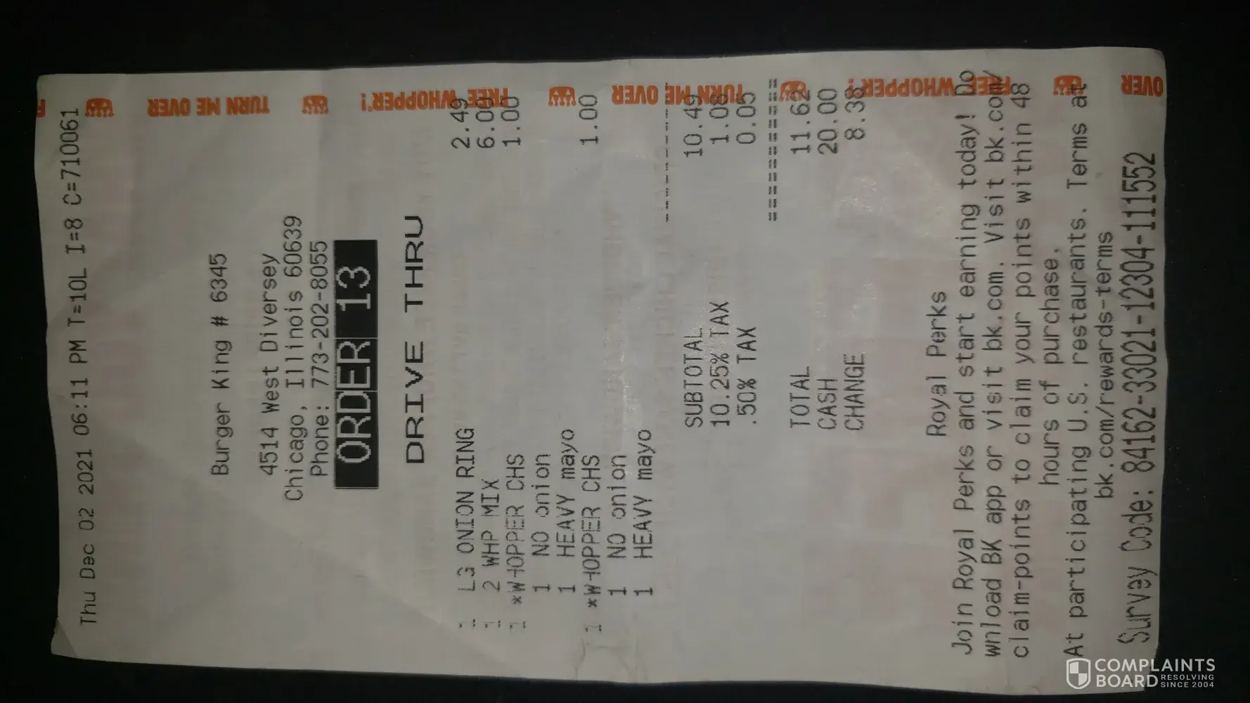 So I ordered my usual, which is two Whoppers with no onions and extra mayonnaise with a large side of onion rings. This is at the Burger King at diversey and Cicero in Chicago. There's a 21 digit survey code at the bottom of my receipt. The website only allows 20 digit codes. This makes it impossible to start the survey much less complete it. Not sure...
