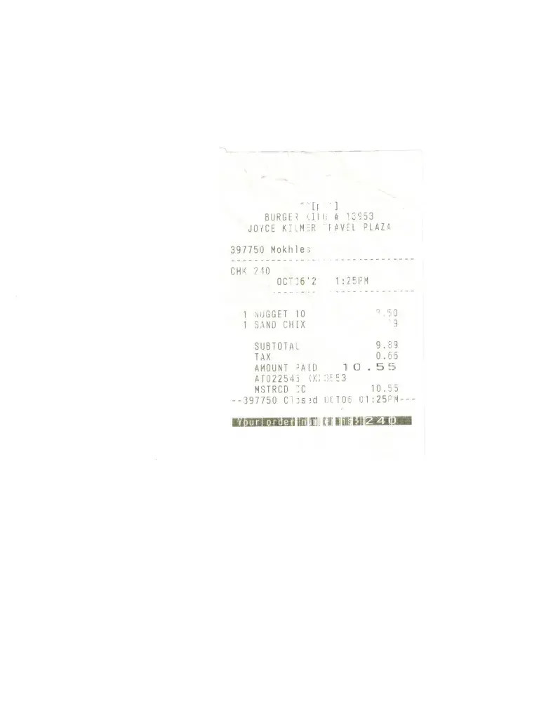 We stopped at the Joyce Kilmer Travel Plaza and forgot to give a code . You see my husband's sister died and we traveled to and from PA to NY via the NJ Turnpike. Our minds were not on crowns. I will scan the receipt and send. It was purchased on Oct. 6th @ 1:25 p.m. We ordered 1 10 piece chicken nuggets and 1 chicken sandwich $10.55.