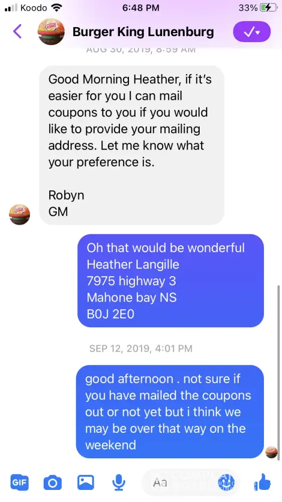 Sept 12, 2019 I was suppose to have a gc put in mail due to food issues. Today, April 3 2020, I have yet to receive and tonight another bad review with a small chicken sandwich that tasted off after one bite, and rubbery chicken fingers. I mean, I would have gone backend waited but drive through had cars and it's still closed to public. Photo from last year is included. Not even a reply.