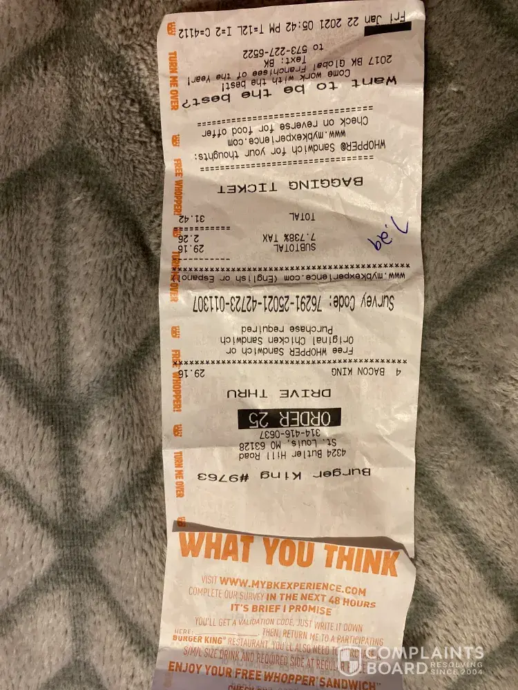 Girl was not trained to print a receipt. Asked...waited...she had to ask two other employees. Then I get a "Reprint" with no survey code. #1947 710 West Union St. Newark Ny 14513 phone [protected]. My order # 298177 Employee 582778 Cadence Worst Whoppers I ever had. Barely any toppings, over sauced, but tasted unseasoned. I have eaten at several Burger...