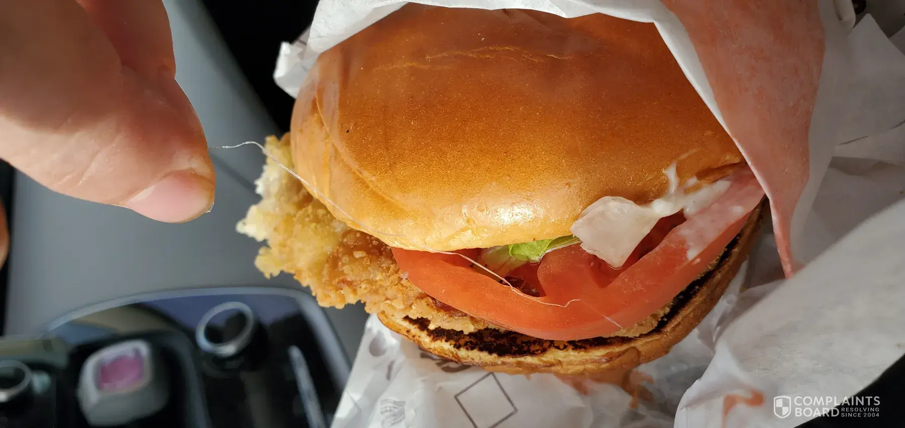 Mu husband and I went through drive through saturday dec 21, 2019. We drove many miles as I opened my chicken sandwich there is a big hair/plastic in the sandwich hanging out. We took pictures then had to drive all the way back. The manager was unavailable so a crew member looked at sandwich and pictures then took the sandwich and gave another sandwich,? I...