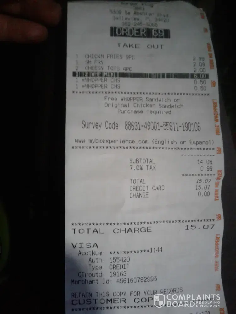 Poorly printed receipt so I cant even submit a survey with bkexperience. Cant read the survey code or store number. I believe I was overcharged for a Whopper meal. No extras, no cheese. I was charged $9.23 when listed $6.59. What a rip off and I cant even submit a survey to get a free sandwich. It would helpful if your receipts were readable or your benchmarks cant be identifiable