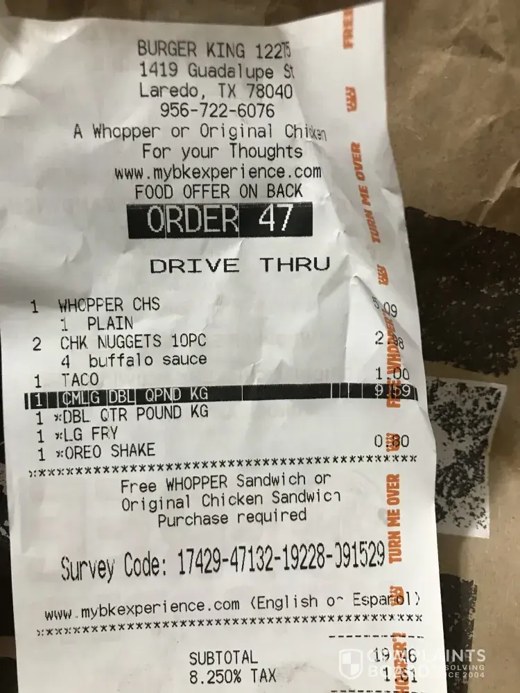 I went to the restaurant (12275) Located in 1419 guadalupe st. Transaction number / order number 47 Date: sunday september 29, 2019 Time: 9:14pm To whom it concern: My experience in this location was really unacceptable due I asked for a number 1 with chesse (whopper with chesse) the burger only. they gave a burger with cheese only, without anything...
