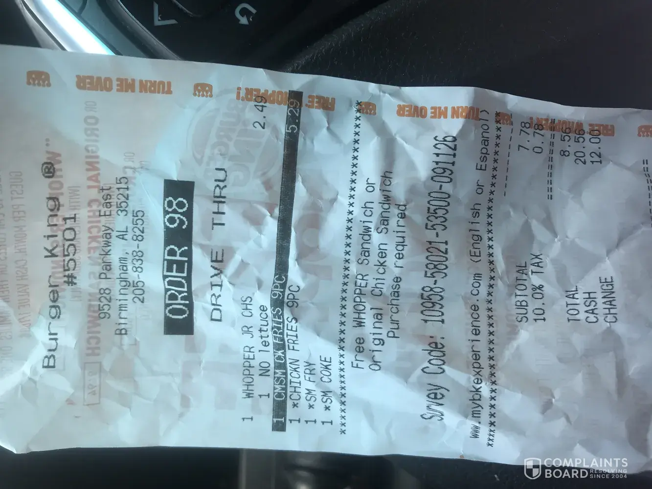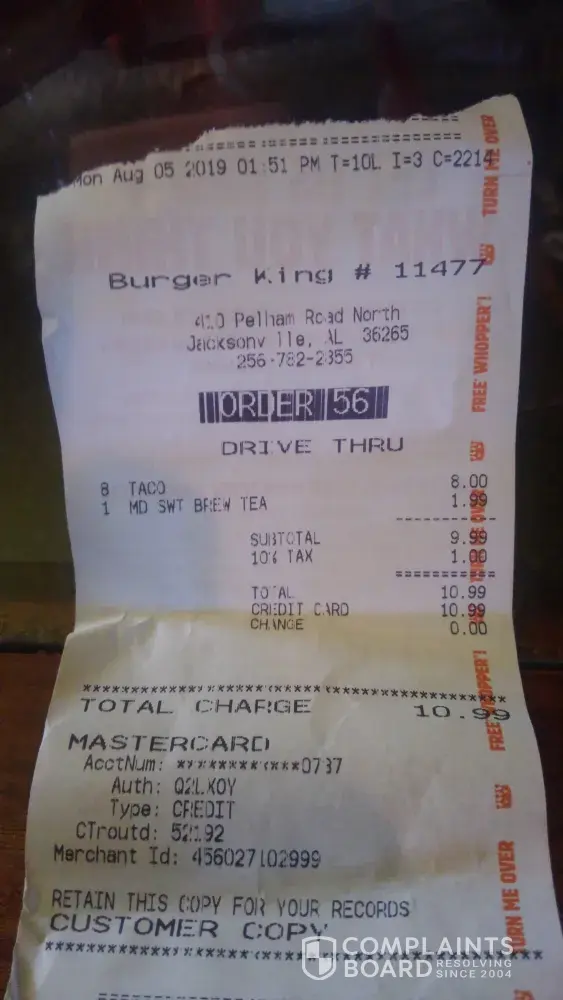71 and 69 refuse to eat MucDonald have been a BK fan for over 20 years Fri Aug 02 623 pm order 17, on the internet this place gets 1.5 star Walked in floor dirty and sticky, tables dirty, one seat not just cut but torn to shreds Ordered two whoppers, two small fry, chicken nuggets, drinks $11.42 Whopper meat dry and cold, assembly sloppy and we had to...