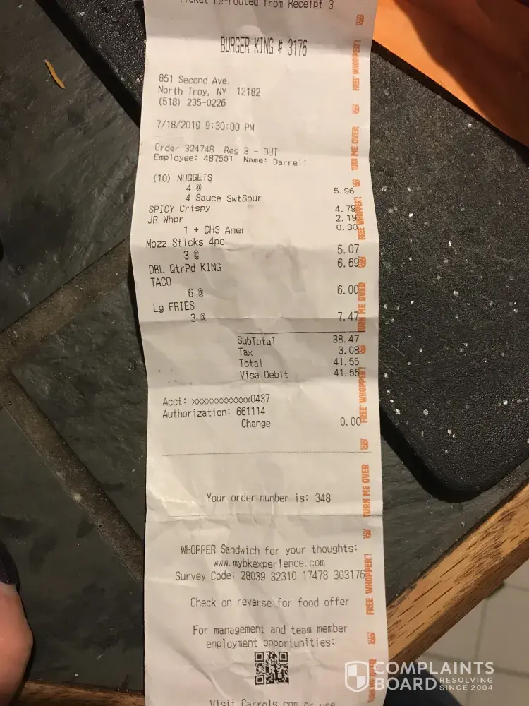 We have gone to this burger king numerous times because we live nearby. The last few times they have shorted us on our food, given us the wrong food, argued with us about how much food we were supposed to get on a coupon. It's been terrible service. Today we ordered the coupon code 9330 for 2 large fries and 40 nuggets. We wait for nuggets to be made and drive away with one large fry and 20 nuggets