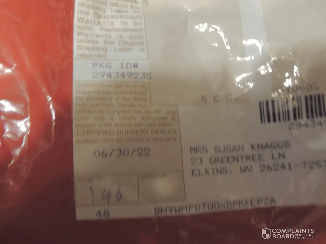 I waited two weeks and then called the company to ask for a replacement. I was told O must send in the packing slip with a note about which plants needed replacement. No pictures of the dead plants accepted.