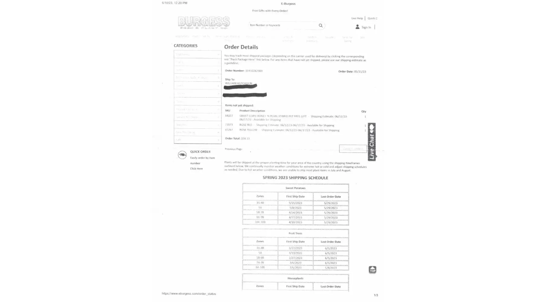 After talking with Latasha, I went back on to the Burgess website and look on their catalog for the roses I had ordered on 5-21-23. I found that both roses were now out of stock. I did know if it meant no further orders would be accepted or if my order would not be sent.