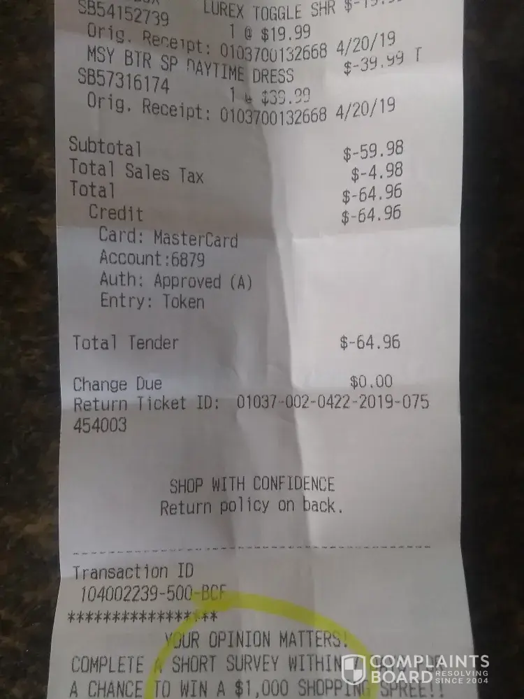 Good Evening: This complaint refers to Store #00344, Transaction #52574, 8:37 pm, Register 004, Cashier: Fariha, on Friday, May 10, 2019: I purchased five items: 2 pairs of mens pants, 1 pair of suspenders, 1 tie, and 1 tie with a pocket square ($8.99). When my son and I left the store, we went straight to my car and went home. Once we got home, we...